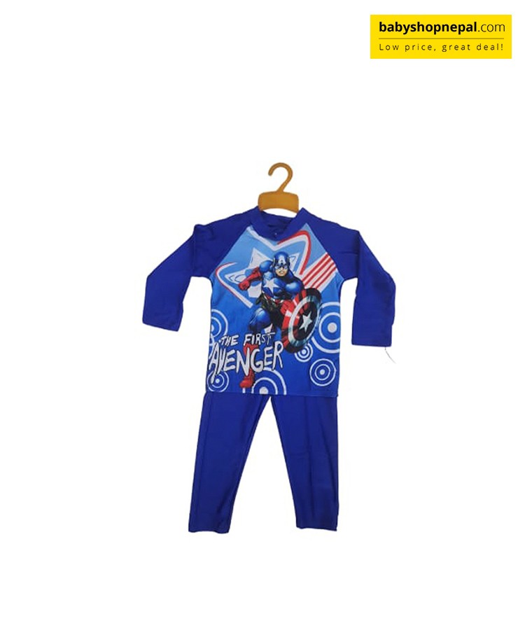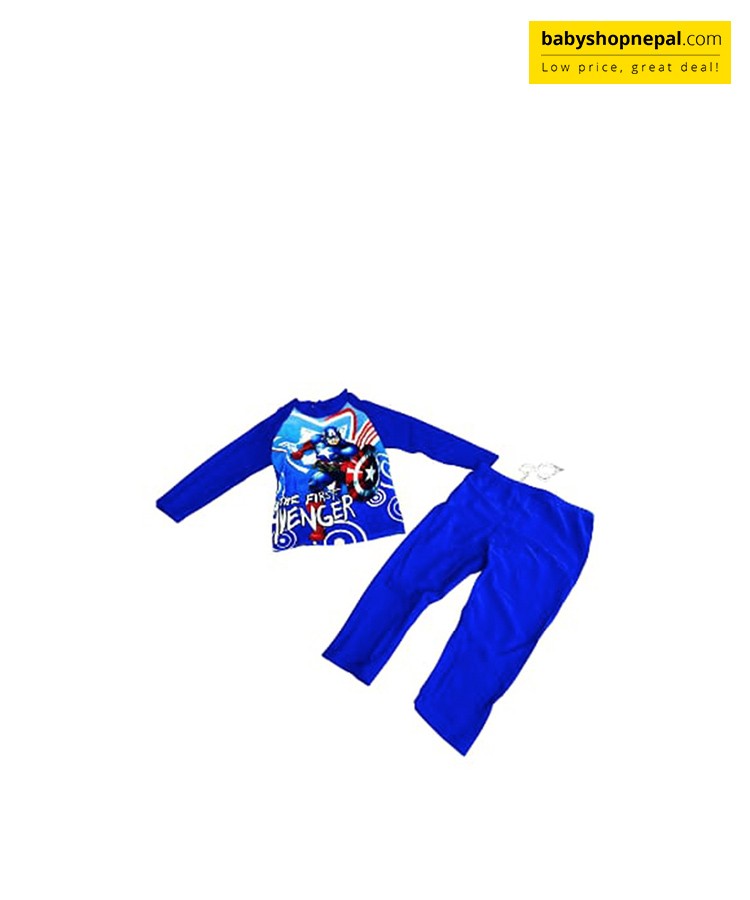 Let your little superhero dive into action with our Avengers Marvel Swimming Pajamas for Boys! This awesome swim set includes a long-sleeved top featuring Captain America in full hero mode, alongside the iconic Avengers logo, perfectly paired with solid blue swim pants for a bold, heroic look.