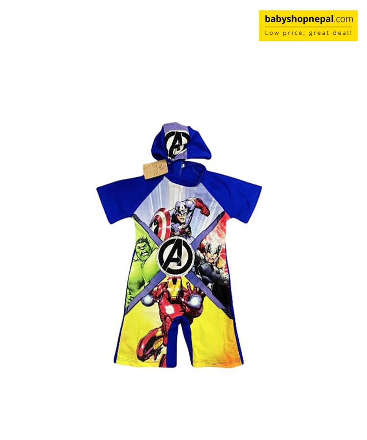 Suit up for water-filled adventures with this epic Avengers One-Piece Swimsuit for boys! Featuring fan-favorite heroes — Captain America, Hulk, Iron Man, and Thor — along with the iconic Avengers logo, this hooded swimsuit is perfect for young superheroes who love to make a splash.