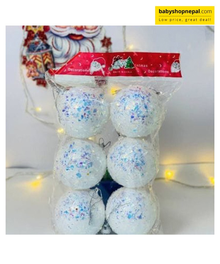 Add a touch of winter magic to your holiday décor with this elegant 6-pack of white iridescent Christmas ball ornaments. Each ornament features a classic round shape coated in soft white color and dusted with shimmering, snow-like iridescent glitter flakes. The frosted finish catches the light beautifully, creating a sparkling, snowy glow that enhances the festive charm of any Christmas tree.