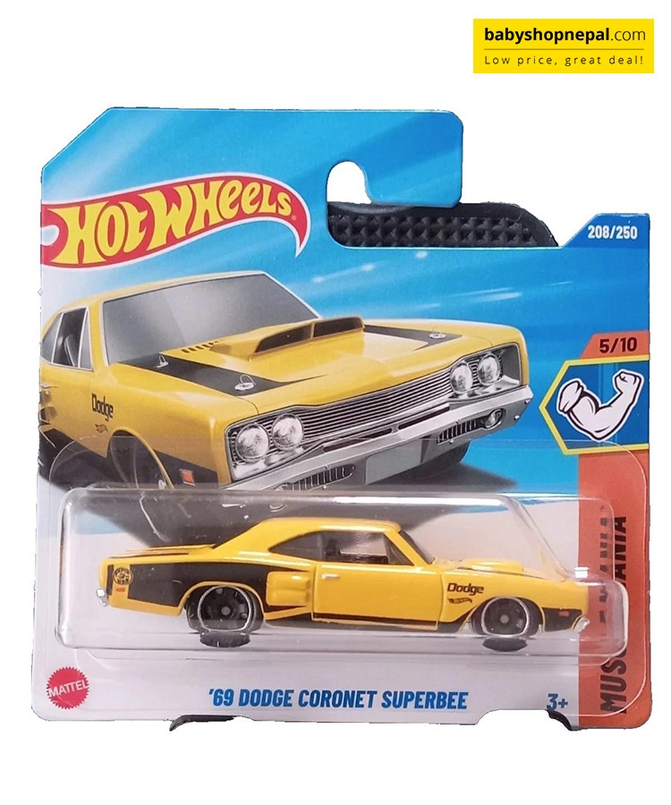 The Hot Wheels '69 Dodge Coronet Superbee 2025 short card is a die-cast car in 1:64 scale, featuring a yellow colour and belonging to the Hot Wheels Muscle Mania series. This vintage vehicle, based on the 1969 model, is a must-have for collectors and enthusiasts aged 12 and above. With an unopened box and manufactured in Malaysia, this Hot Wheels car combines nostalgic charm with modern toy standards, making it a standout addition to any die-cast vehicle collection.